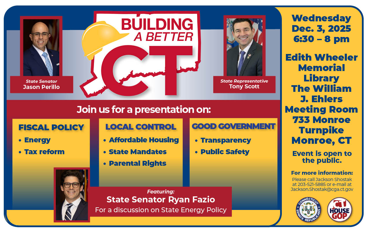 Jason Perillo, elected to the State Senate in 2025, represents Connecticut’s 21st District, which includes Stratford, Seymour, Shelton, and Monroe. He was first elected to the Connecticut House of Representatives in 2007, where he was appointed Deputy House Republican Leader in 2020. Senator Perillo, a lifelong resident of Shelton, he has dedicated his life to serving others and to making his community a better place to live, work, and raise a family.